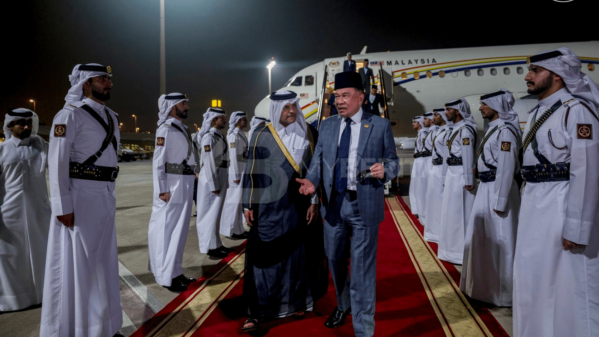 Pesawat khas membawa Anwar mendarat di Lapangan Terbang Antarabangsa Hamad pada pukul 9.30 malam Ahad waktu tempatan (2.30 pagi Isnin waktu Malaysia), selepas berlepas dari Pangkalan Udara Tentera Udara Diraja Malaysia (TUDM) Subang pada pukul 7 malam.