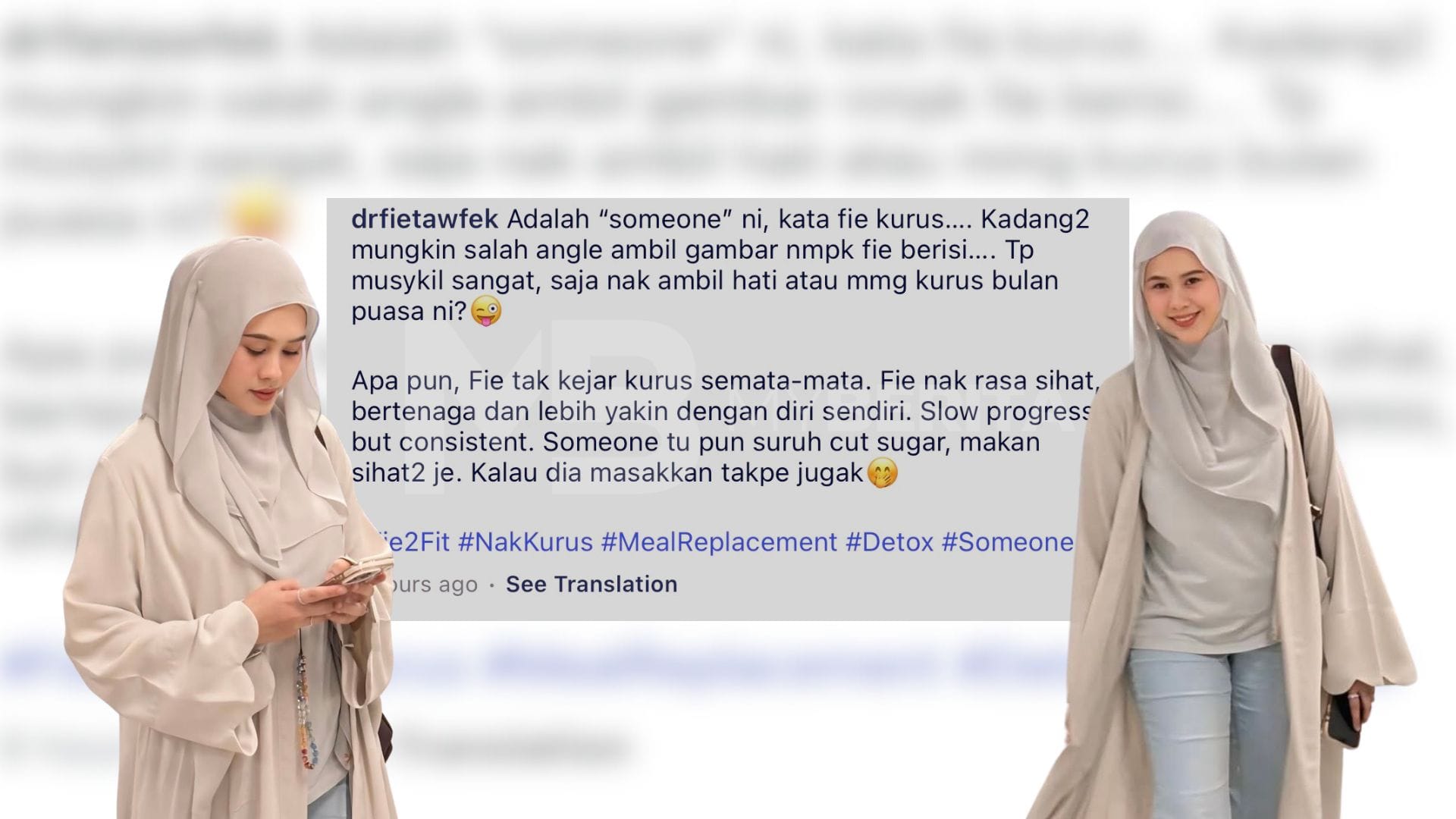 “Adalah seseorang kata Fie kurus. Kadang-kadang mungkin salah ‘angle’ ambil gambar nampak Fie berisi. Tapi musykil juga, saja nak ambil hati atau memang kurus bulan puasa ini.