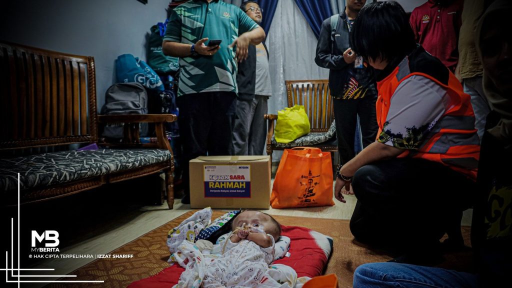 Pegawai JKM menyantuni pesakit hidrosefalus sambil menyampaikan bantuan makanan sahur kepada keluarga penerima.