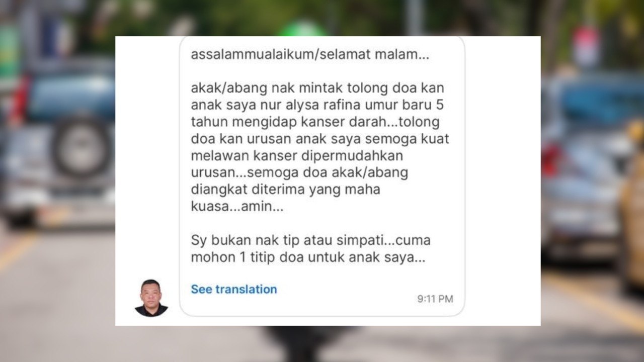 “Masa order makanan dekat Grab, abang rider tu minta satu saja, tolong doakan untuk anak dia. Tak mampu tolong banyak, tapi doa kita semua insya-Allah sampai. Jom sama-sama doakan anak dia diberi kesembuhan dan dipermudahkan segala urusan,” katanya.