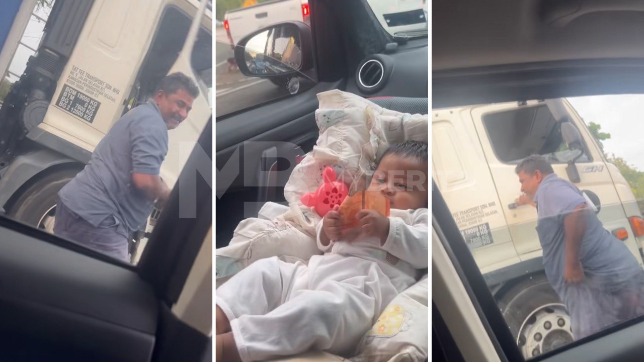 Dalam video berdurasi kurang 30 saat itu, lelaki berkenaan dilihat turun dari lori dan menghampiri kenderaan mereka sebelum menghulurkan wang RM20 kepada bayi tersebut.