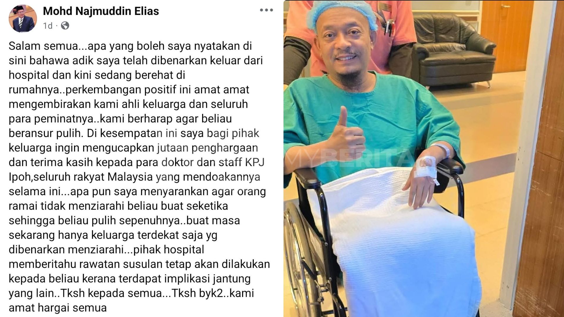 “Adik saya telah dibenarkan keluar dari hospital dan kini sedang berehat di rumah. Perkembangan positif ini amat menggembirakan kami sekeluarga serta para peminatnya.